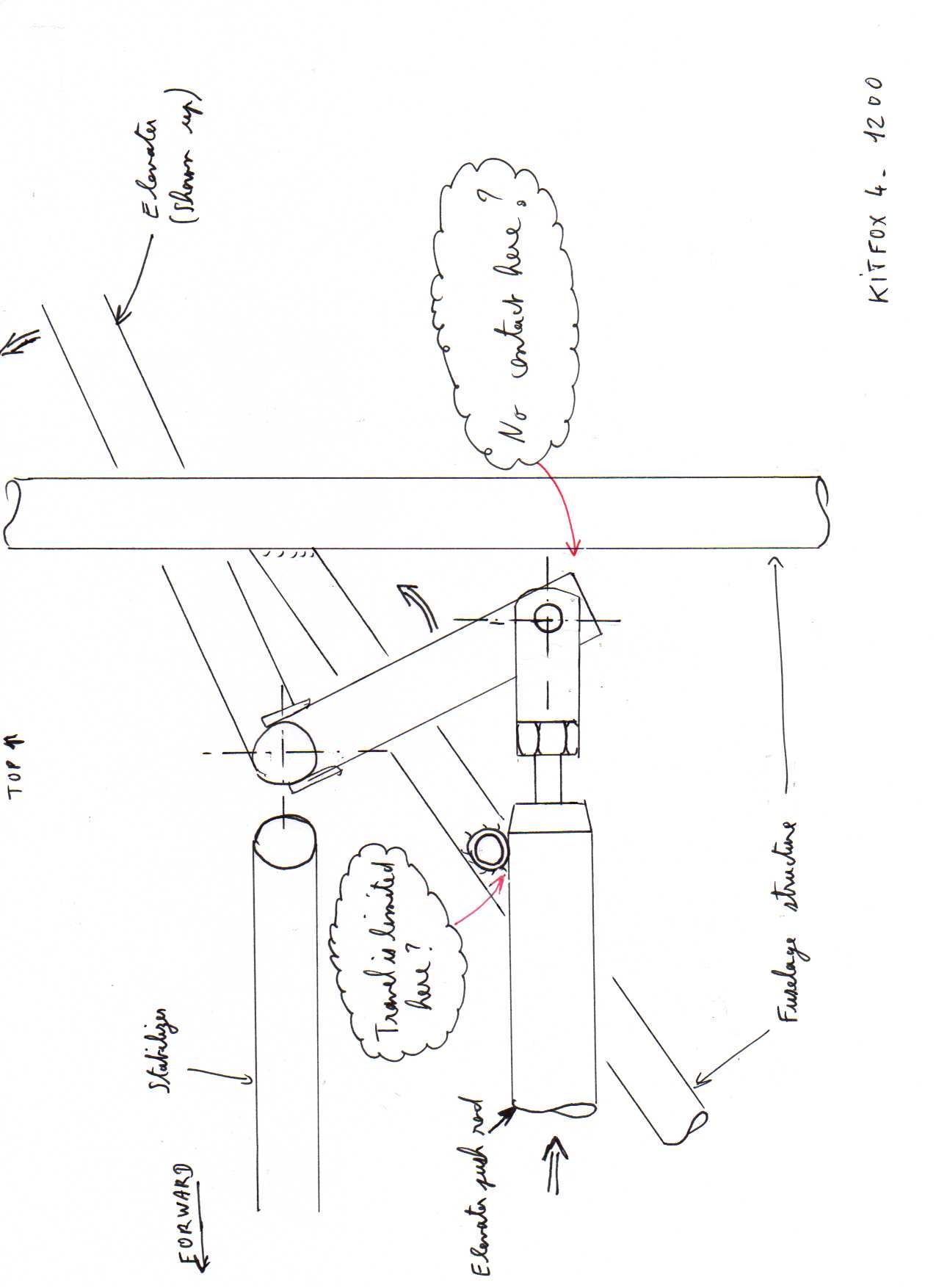 One mine, the upward travel stopped when the push/pull rod hit the little transverse tube normally used to stop downward travel. (See the attached skecth). I checked with John McBean (Kitfoxaircraft) who confirmed that the upward travel normally stops against the rear vertical.