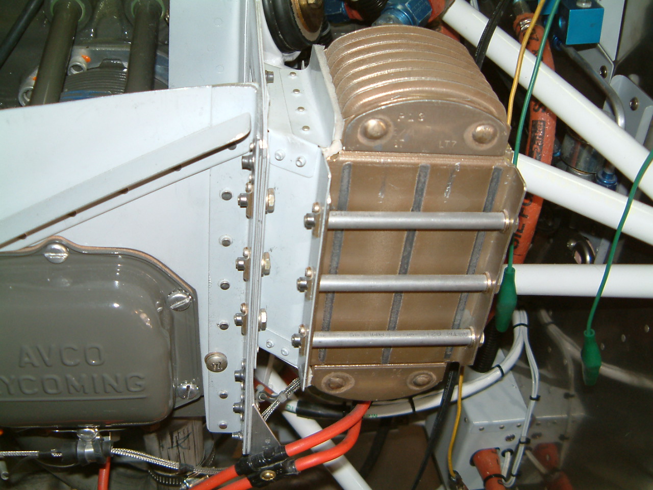 That said, sheet metal (baffle aluminum) can't carry much of a load either, even if you use a standard bolt and nut. I would recommend installing at least a 1/8" thick (3/16" is what I used) doubler riveted to the sheet metal over the whole general area where you intend to make the oil cooler attachment in order to spread the load and stiffen the part, use long standard bolts to go thru both the front and rear oil cooler flanges and attach using all metal locknuts. Use all six mounting points and make sleeves/spacers to go in between the oil cooler flanges out of steel tubing. This is not a place to wimp out with a light duty attachment. As Jerry Lee said, there's "a whole lot a shakin' goin' on".
