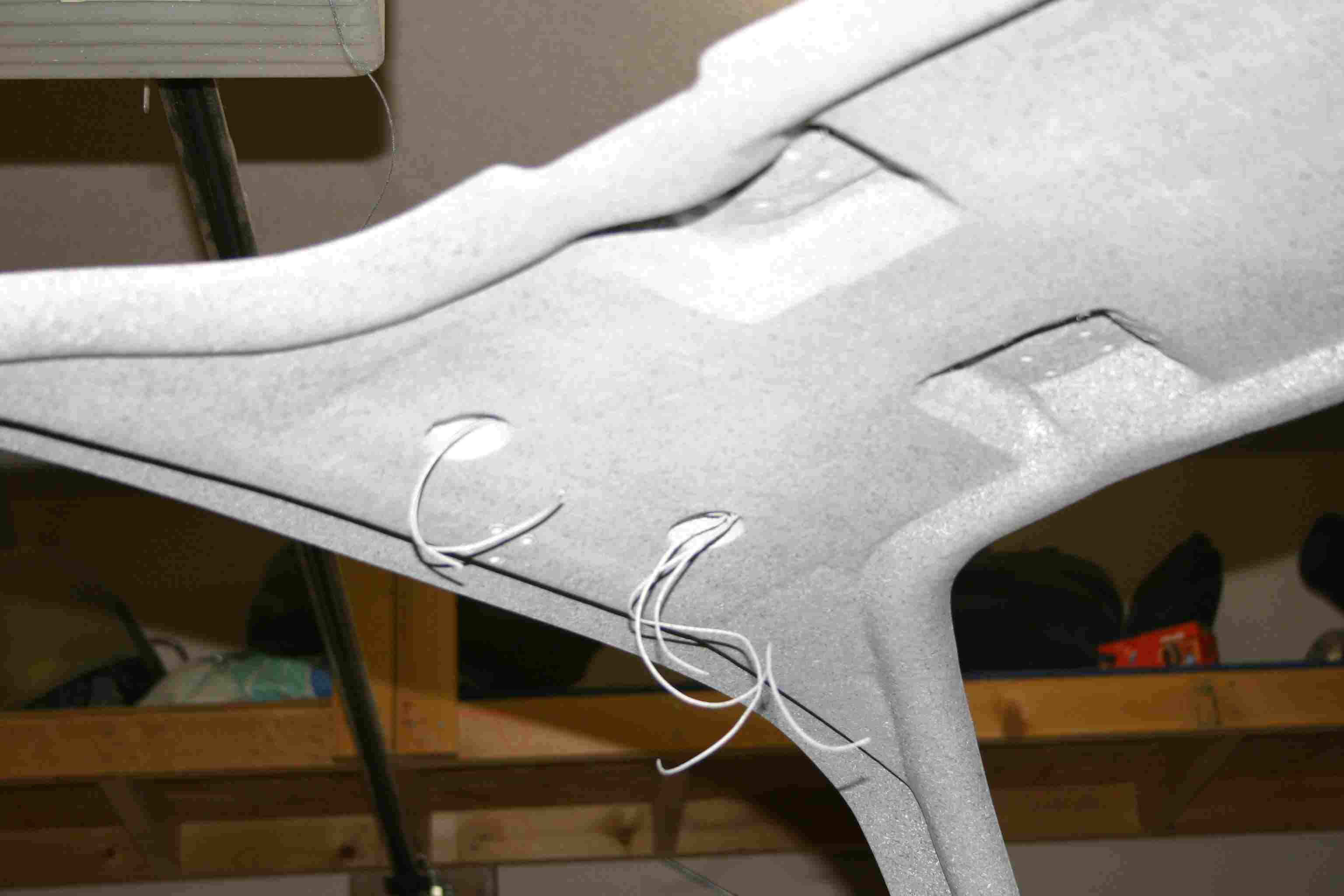 They aren’t the greatest but they are all I had with me at work.  You can see the three wires coming out of the bottom by the front pillar on the passenger side.  The wires run up on the inside to the center of the canopy and then I drilled a tiny hole for then to run into the foam which is in the top lid and then they come out the 1 ˝” holes I drilled on the inside top.  I removed about ˝” of the foam and then glassed in the bottom again.  This will allow the swivel eyeball to move freely.