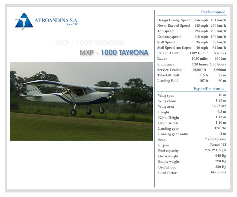 I have looked at the photos on AMD's site and the Aeroandina S.A. sites. The Patriot looks identical to the MXP 1000 Tayrona. Even the paint job looks identical. The performance data is identical except for fuel capacity and the fact that the Patriot has a Continental O-200 engine and the Tayrona has a Rotax 912. Amazing coincidence? I think not.