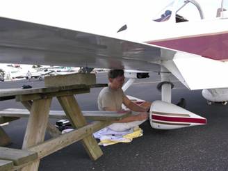 Picnic tables/jack stands are handy too. The Owner’s son and attendant that day in Pahokee, FL was very kind and lifted the wing gently and I slid the table jack under the tie down hook. Pic attached, been saving it for this occasion.