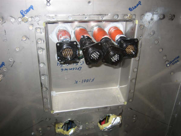 After the pass-thrus are in the firewall the FWF side connectors are mounted on to the back side of a SS plate which covers the recess.