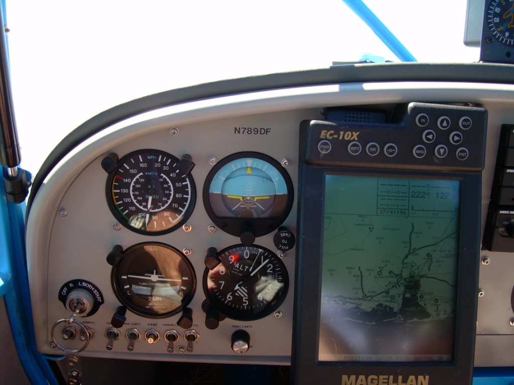 | The Magellan EX-10X has been replaced and my Fujitsu, P1610 XP Tablet (powered by Anywhere Map) now sits in its place. The turn and bank indicator (bottom left) has been replaced with the TruTrak autopilot. |