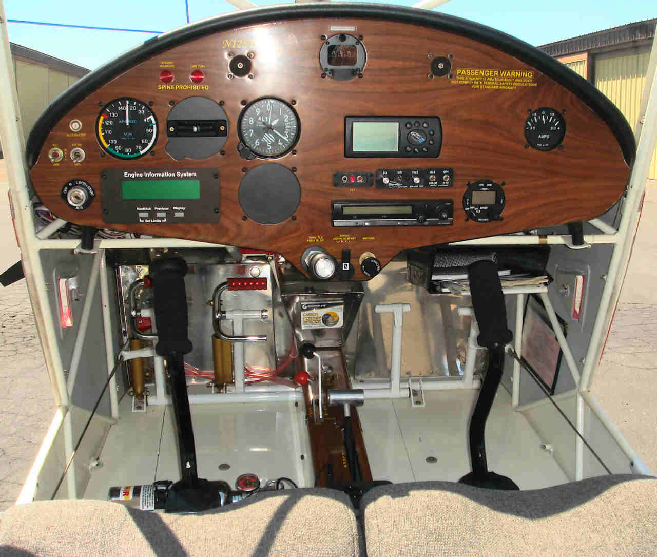 Here's mine! Basic VFR. The best thing about it is the EIS! How's that for a difference of opinion! The only other "unique" thing is the Becker transponder. I paid a little extra for a minimum weight unit; as you can see, I have a major in minimum weight, with a minor in aesthetics. (The original builder had a T&B and VSI which I didn't install because I didn't think I'd ever use them and I saved a little weight.) By the way, the panel's carbon with a wood veneer clear coated with semi-gloss Sterling.