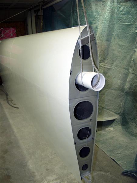 I'll include one shot of how I suspended the wing -- on the spar end, it's a small block and tackle, on the other it's left over pvc drain pipe on a hook in the ceiling. The wing has enough mass that it doesn't swing when spraying it.