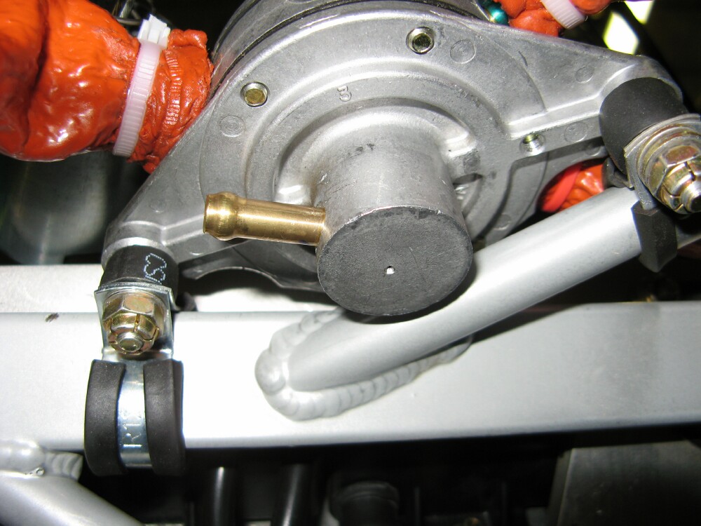 Personally I think it should be on the bottom of the casting C since I mount mine vertically. However it's actually in the brass elbow where the pulse line attaches. This means the pump is supposed to be mounted flat C with the logo up. Who does that? Some day I'll mic the existing hole C replace the elbow C and drill a new one the same size in the casting. Right now I suspect my pulse chamber is constantly 1/2 full of fuel/oil/whatever.