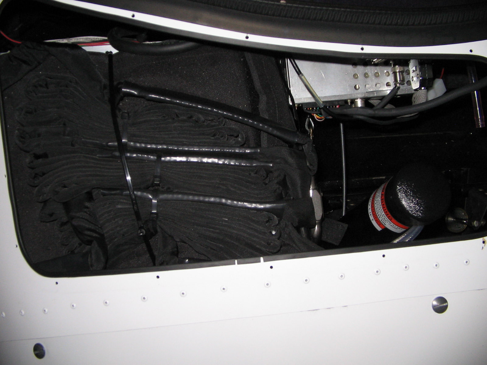 The rear portion of the canopy would be in the way if the BRS were mounted in the baggage area (assuming usage of the 650 canopy), which is one reason why I want to put my BRS up front. The bracket that the rocket tube is mounted on is bolted to the cabin side of the firewall, and the rocket fires up through a frangible cover on the center-front portion of the forward top skin (ahead of the front of the canopy).