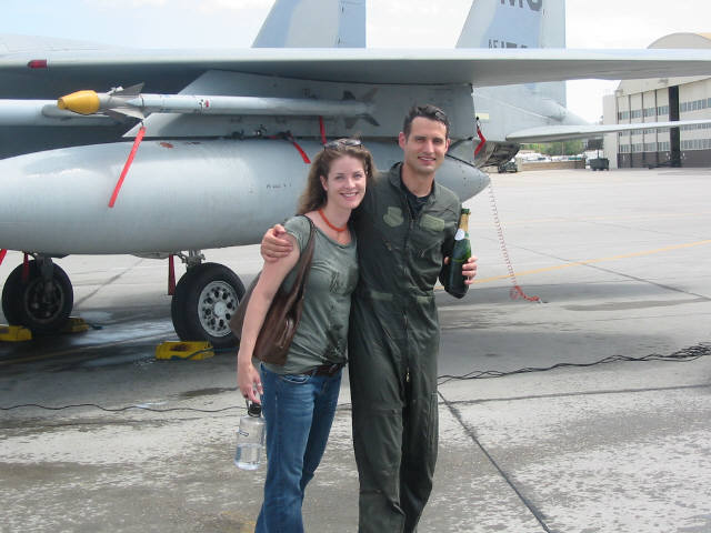 This week was something of a big transition for me. I had my last ever flight in an F-15 on Thursday (pictured below after being hosed do wn). And today I moved my RV-10 from my garage out to the hangar. I've been worry ing about how I was going to transport it as most trailers are only 6 feet wide. You can see I used a 4x8 sheet of 5/8 inch plywood strengthened by some 2x8 and 2x4 boards underneath to extend the trailer width out to 8' - perfect for the ge ar. It was easy to load and unload and traveled great.