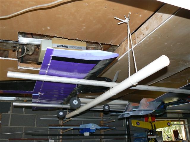 Nothing special, right now it just supports a bunch of RC planes. But since you asked... Each wing lays on two lengths of PVC pipe, on at the root, one close to the tip. For the one close to the tip, one end is tied to a hook in the ceiling, the other end is stuck through a loop of rope. Lift the loop to the side, and let the PVC hang straight down. The wife and I carry the wing into the garage, raise the wing up high, and I lift the root end up over and lay it on one piece of PVC.