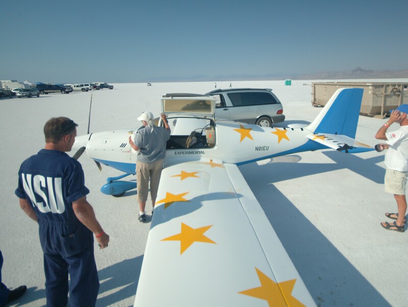 I was asked by a German motorcycle team who was participating in the Bonneville Salt Flat Speed Trials 2006 to fly the Camera team. Took my magic carpet to Wendover Airport in Utah / Nevada and landed on the Utah Salt lake. This basically is a 35 * 35 mile runway of flat salt. Fitted a TV camera to the elevator and flew 17 times off the Salt. What a ball !