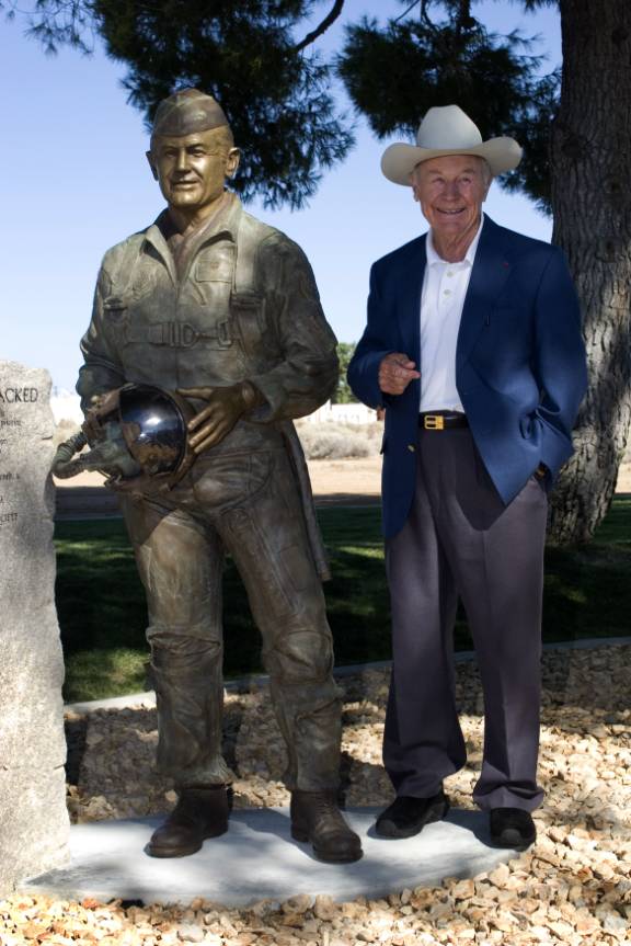 The statue was dedicated in a ceremony at the corner of Rosamond and Yeager Blvd a street named in the General's honor. A dubious honor by Yeager's thinking: They name streets after dead people, he noted during his remarks.