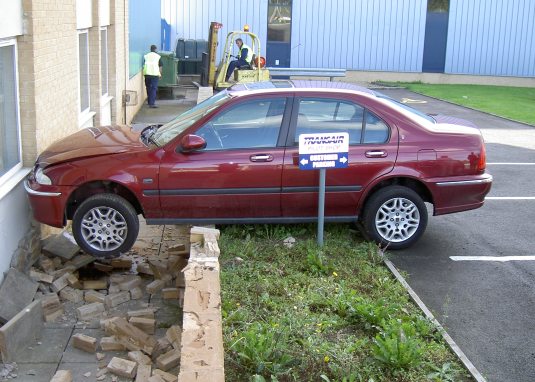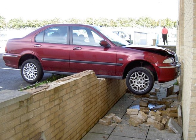 The lady driver obviously mistook the meaning of the Transair parking sign. She almost made the inside of the building before coming to rest balanced on what remained of the wall. As all four wheels were off the ground this was obviously within the remit of ATC and Gloucester SATCO Darren was quickly on the scene to oversee the rescue effort. A bit of dexterous fork lift handling by the fire crew soon had the car back in the parking lot.