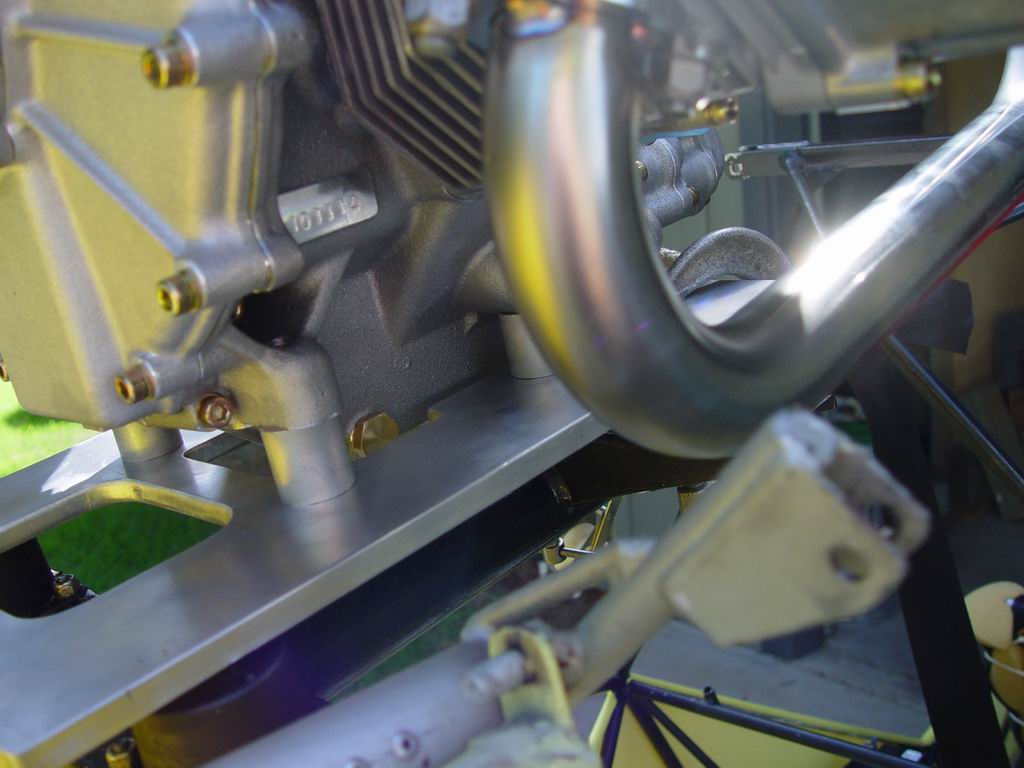 The engine had to be mounted forward enough so the exhaust manifold pipes clear the aileron torque tubes and control horn when folding and unfolding the wings. This will require a prop spacer to give adequate prop clearance from the aileron torque tubes when flying.
