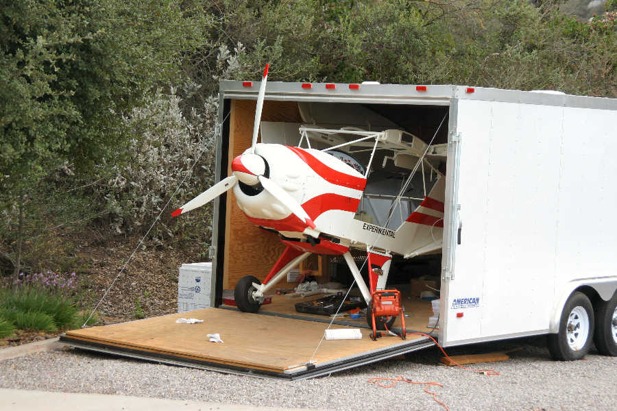 I looked at a lot of box trailers and found most of them too narrow at the door. Mine has the tail lights in the door so the opening can be wider. You can have the trailer made any height, but I was impatient and bought one off the lot with a 75" door opening. I wish it was 6" or 9" higher, since I can't put bush wheels on and fit the plane in the trailer. I also bought a 22' trailer, but a 24' would be better, as my plane fits with only 3" to spare, length-wise. I bought the 22' because it was a lot lighter. (7000# gross versus 10000# gross.) Again, you can have lighter trailers made custom for the same price, but the resale plummets. (These trailers are typically used to move cars.) I put six tie-downs inside and my plane seems to ride very comfortably. I also made wing supports, and will be making a tail support to unload the tail wheel when trailering. (I'll use the wing supports any time the wings are folded, since the fuel weighs a lot.)