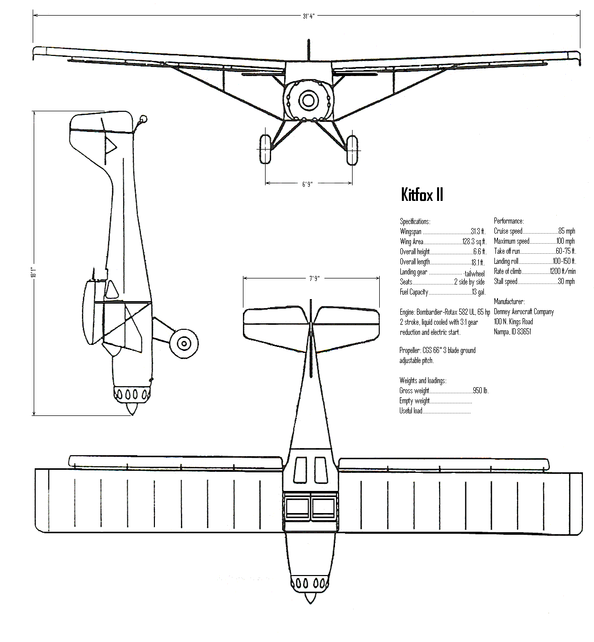 I'm attaching a 3 view drawing of my model 2. I don't think the outside dimensions changed much from M2 to M4. I've been towing from home garage to the airport (6 miles each way) since last July, using an open trailer and fore/aft wing trailering braces. I drain fuel to lighten the load and support the tail to save the tailwheel spring. It seems to work fine. I know there are alot of others out there who do the same. I think this is what Dan Denney had in mind when he designed the Fox with folding wings.