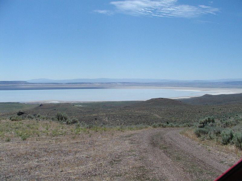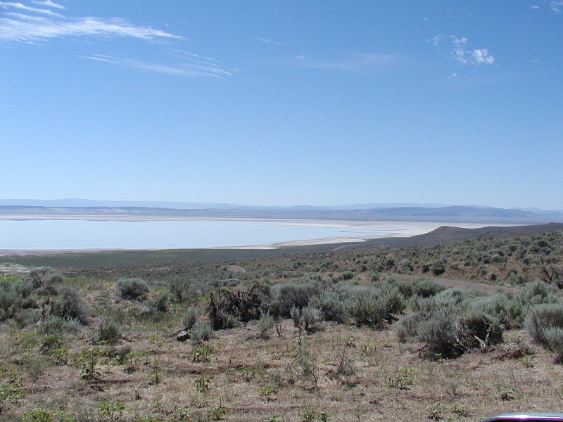 The wife and I needing a break from all the hassle of trying to get a new house in shape took a trip cross country to the Alvord Desert by dodge truck rather than Firestar. As you might remember the Alvord has been a stopover by the Monument Valley travelers for the last two years. It is normally a dry lake bed that is 6 miles wide and 11 miles long and is the favorite visiting spot for Ultra lights, motorcycles, windsailors and glider pilots. One of the highlights of the area besides the lake bed is the Hotsprings that are nearby. One of them is Mickey Hot Springs. This particular hotsprings is not one for soaking. It is too hot. The water is near boiling and a drunk managed to remove himself from the gene pool by jumping into it. When we got to the Alvord itself we were surprised to find that the water is still very high in the lake. The temps have been in the 100's for weeks, but it is still not enough to dry the lake out this year.
