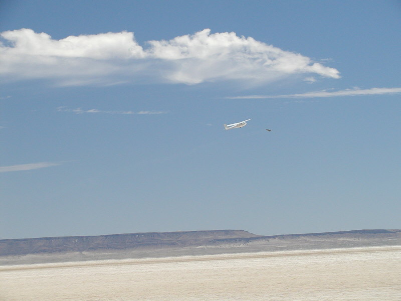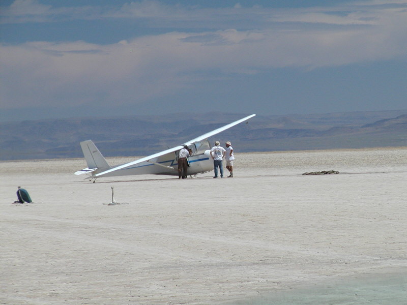 We decided to drive up to the entrance to the lake bed and son of a gun, there were gliders on the lake. I asked the wife what they were and she foolishly said " go see". It turns out it was a glider club from the Willamette Valley. (400 miles north by road) So I introduced my self and asked questions about the planes, where upon they asked me if I would like a flight? Naturally I took them up on it, leaving the wife and the dogs in the truck. Surprisingly even at 90 degrees oat. there was no thermals, which was just as well since it made it a lot easier to get back on the ground quickly. The glider was a trainer and not one of the more efficient types of single place ones, but the glide was still pretty impressive when one is used to a Firestar with a 8 to one glide rate. The performance was a lot similar though, stall at 40 mph ( mine is lower) landing speed is 50 mph, but man the air brakes and skid on the nose are serious. It was fun, but I will stick with a motor and the firestar.