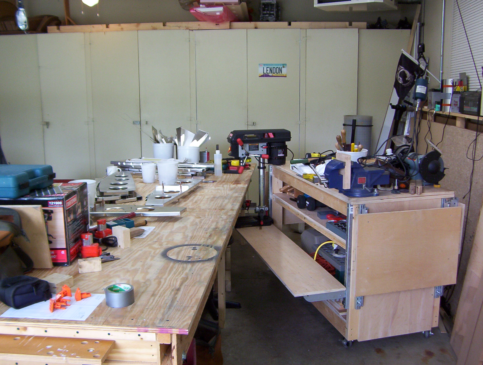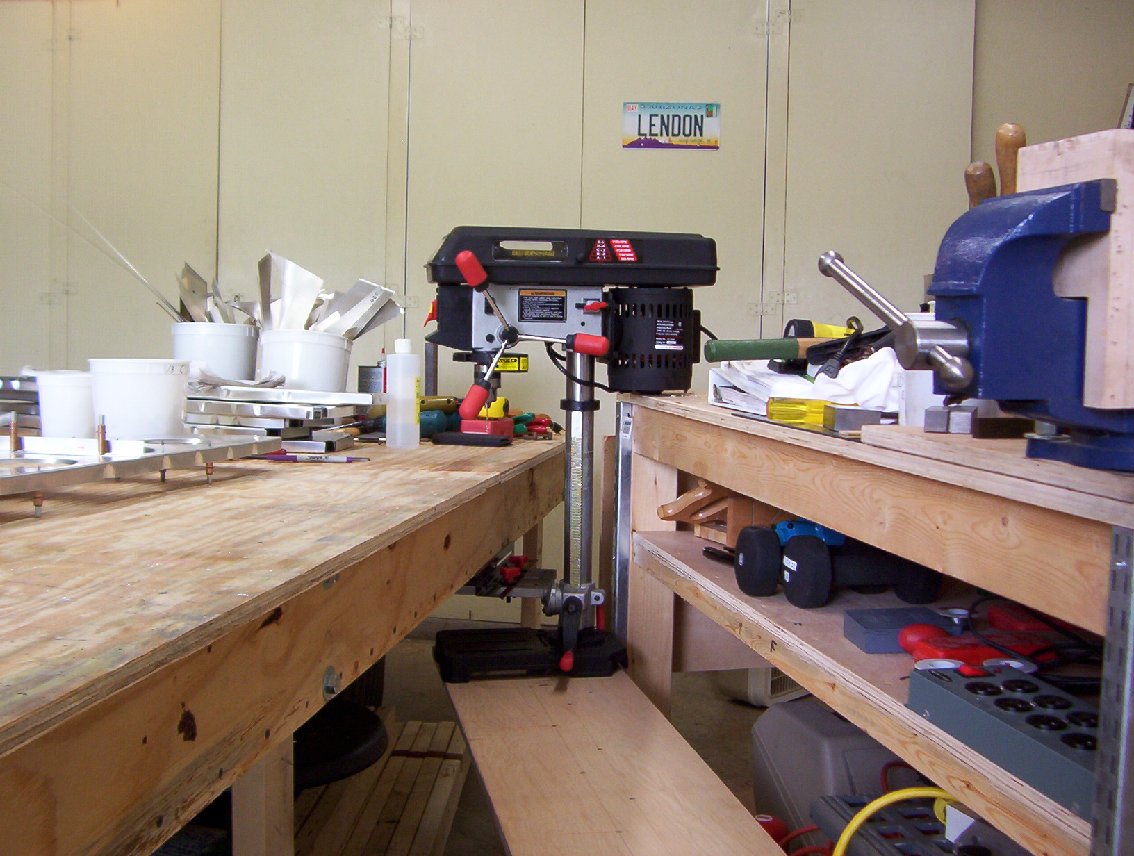 | Shot of the workbench with the drill press lowered for table top work. |