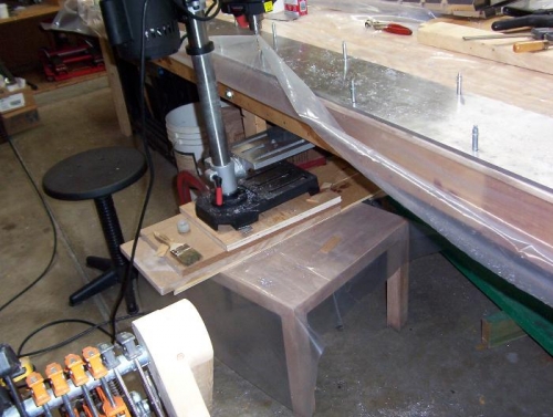 Ever since I started thinking about drilling my spar caps, I've been scratching my head about the best way to drill perfectly aligned holes into them and still support the remaining ends so no bow is built into the spars. I've seen where other guys set their drill press beside their work table and swing the head around, and I even tried it, but it was a little like driving a car from the back seat. It was hard for me to make sure everything was perfectly aligned, and for this critical drilling operation I felt like I needed to be a little more in control.