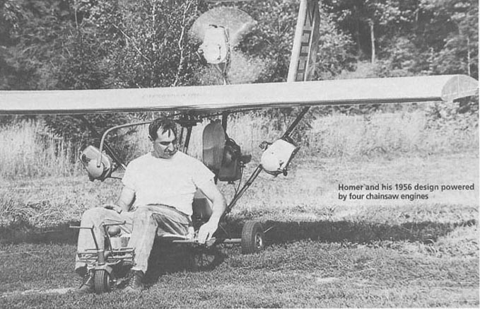 The picture is of Homer Kolb with a 1956 design powered by 4 chainsaw engines, I guess this proves once and for all who the "real father" of ultralights really is.....