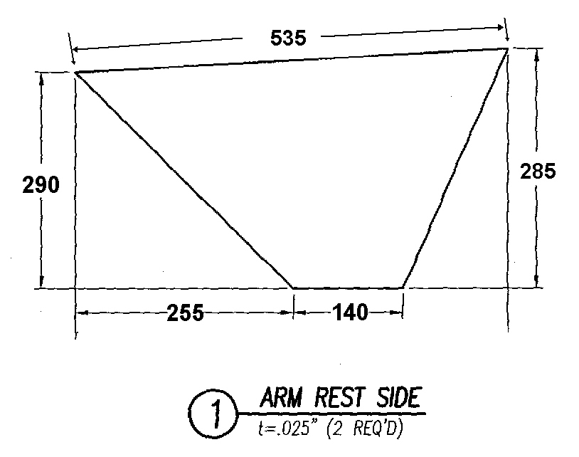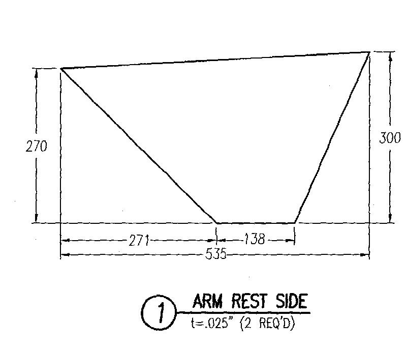 Close, but no cigar. I made the same mistake in not rotating the 535mm dimension. The 535mm on the plane is measured from the spar web to the rear support. Where I have the 535mm called out on the second sketch is on the top edge. What I forgot was that the right corner of the top edge is about 100mm above the rear support, so the 535mm and 320mm will be longer. We're getting there- I'll post the final dimensions. You could make a factory arm rest side fit, but only at the outside boundaries of the +/- 2mm general tolerance.