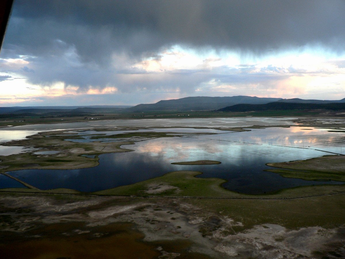 I took a neat picture of Alkalai Lake Saturday evening while waiting for a squall line to blow past Bonanza International alfalfa patch. Easter morning there were sand hill cranes and specks all over the field. (did I mention you can see my new wheels and tires in the foreground?)