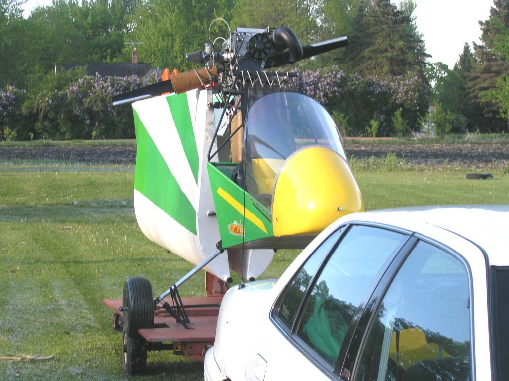 It's small and easy to maneuver with the single axle. It has negative tongue pressure, which means when I remove it from the ball hitch, the tongue goes up and it rests on the tailwheel. If you think it would be unstable on the road, it's not. This is because the slipstream acts like a huge rudder going down the road and actually stabilizes it. I've trailered though some heavy winds with this. The faster you go, the more stable it becomes. In a good wind I can feel the back of the car moving a little. I only go about 7 miles to the strip, so it's not too bad. I wouldn't want to trailer it for long distances, but I'll bet I could. Here it is in my garage. I haven't ever had any problems with this, but I have to make sure the trailer wheels are chocked and the tongue prop is secure before unloading. If it moves, the wings can get dented easily. I have to be very careful.