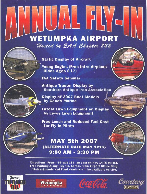 For the YAK/CJ drivers in the southeast, attached is the flyer for Wetumpka’s fly-in on 5 May 07. Details are also posted under the airshow tab on the RPA website.
