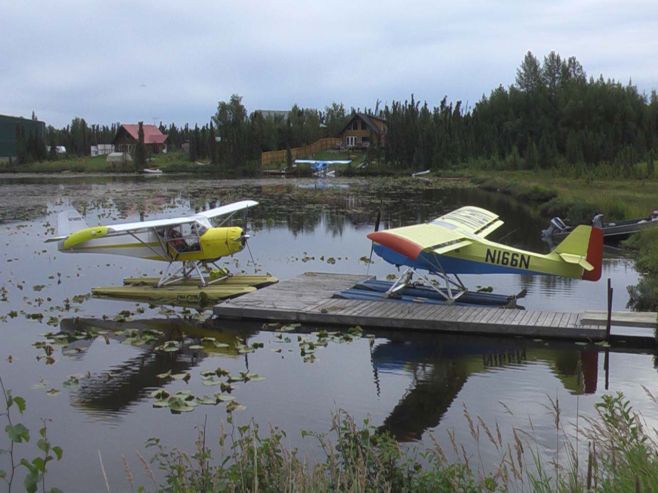 Attached are a few pics of a flight around Cook Inlet and Tuxidney Bay as well as one of us tied up at John Stoners dock. As you can see he has the original skystar rigging and placement. We are trying to talk him into moving the floats so he can get off the water at gross weight.