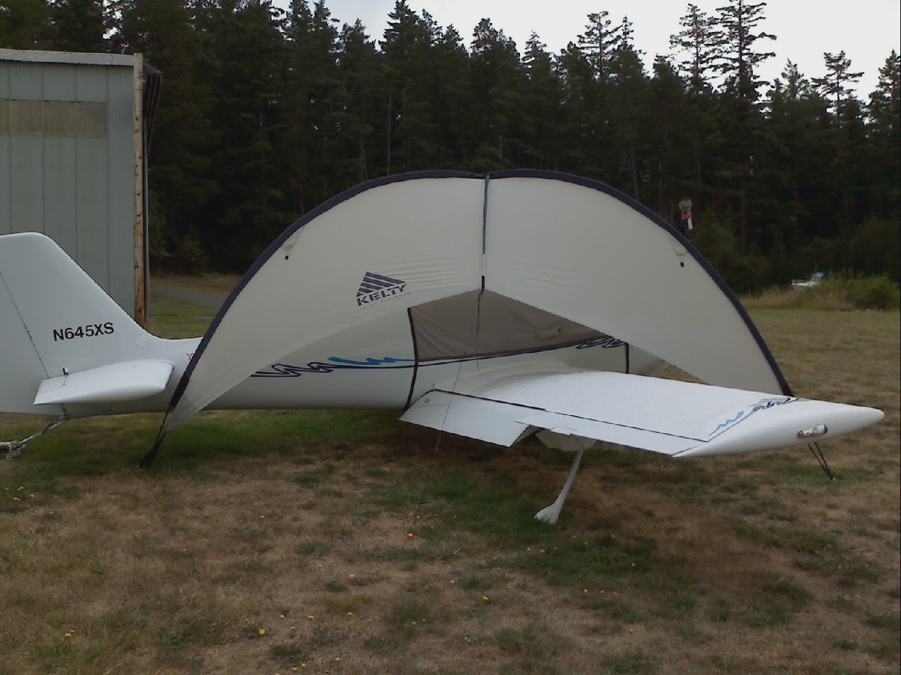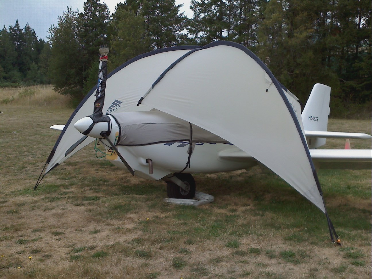 For those of you looking for something to keep the sun off most of the plane and the occasional rain. I purchased a Kelty large sunshade, its light weight and collapses down to about 30 inches by 6 inches in diameter. You will also note my bird Chaser on top of the prop, keeps the pesky guys off a nice perch!