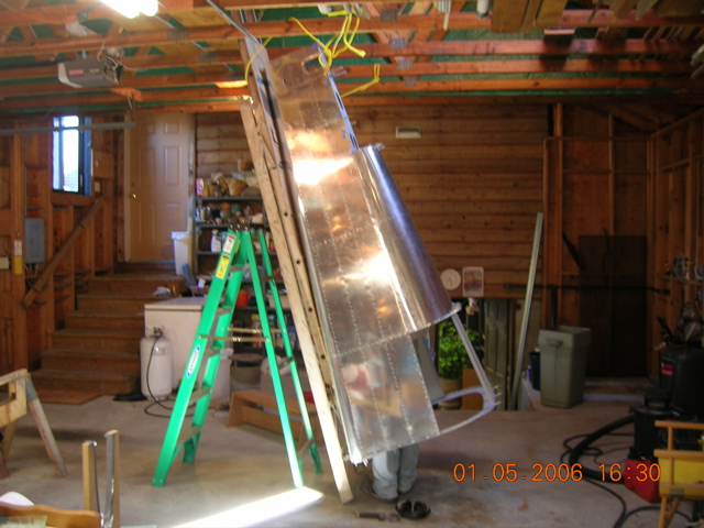 For the tailcone (RV-10), it was quicker to just set up a ladder and use the tail hook to secure it, Put some padding on the ladder. The bottom skin (J bars) had been completely back riveted before it was assembled into the sides and tops. Leave room at the floor to get inside. See the feet of person inside! The very aft end was finished by putting the tailcone on some low saw horses. In the pictures, the skins aft of F109? are still clecoed.