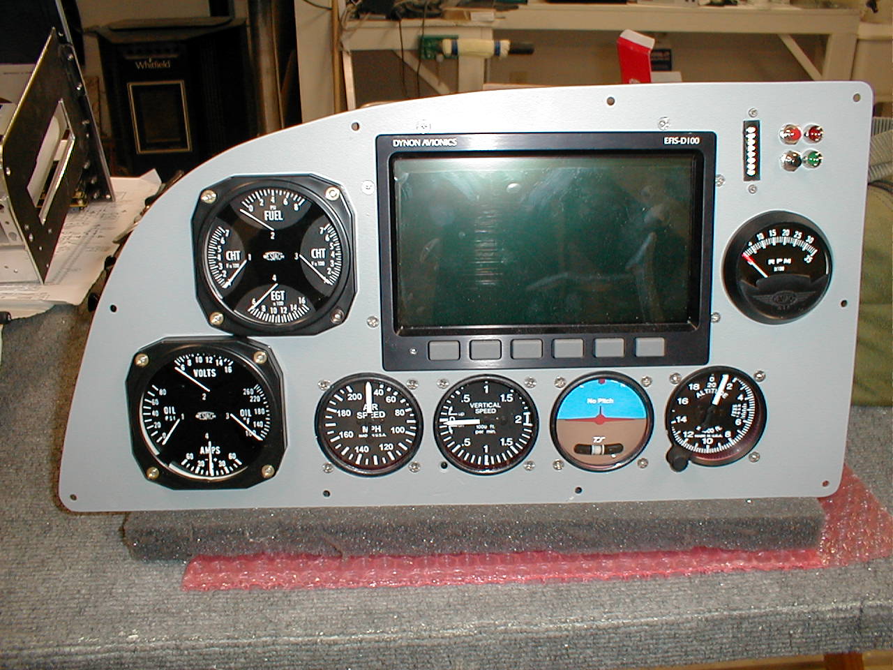 Still building, but this is my panel so far. But use the Dynon EFIS D-100, with it's internal battery back-up, as the main instrument, with the four 2 1/4" back-ups below. AOA to the right of the Dynon. The two quad gauges to the left now have a three position rotary switch so I can monitor all six cylinder temps. The only change so far is that I have replaced the redundant tachometer with a GT-50 from ACS. Though primarily for a G-meter, it is wired to my Emergency buss so that it's voltage reading will be my "Fuel guage" in the event of a alternator failure.