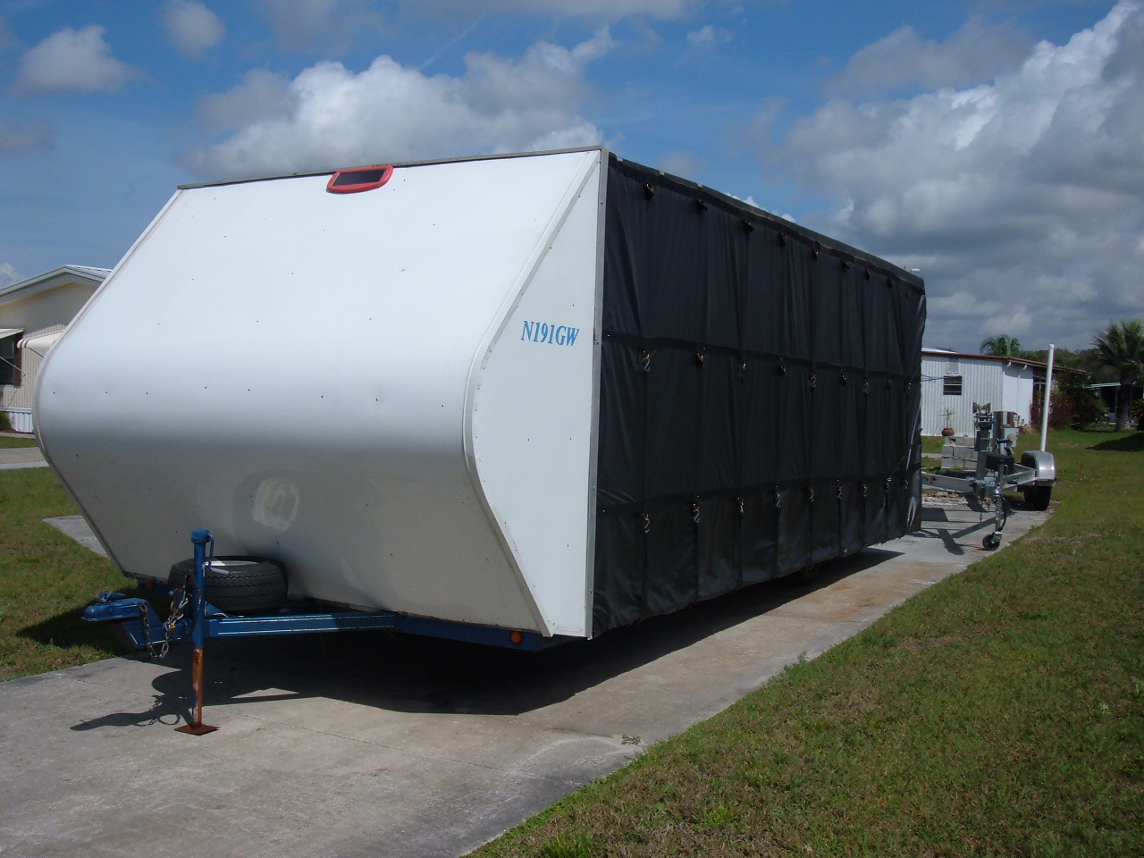 These are some pics of my trailer built from a tandem boat trailer it's 8'6" wide 22' long made from EMT welded together with sheet metal has the hand wench if needed to pull it in cost was $1100 makes a great hanger for here in North | Quote: |