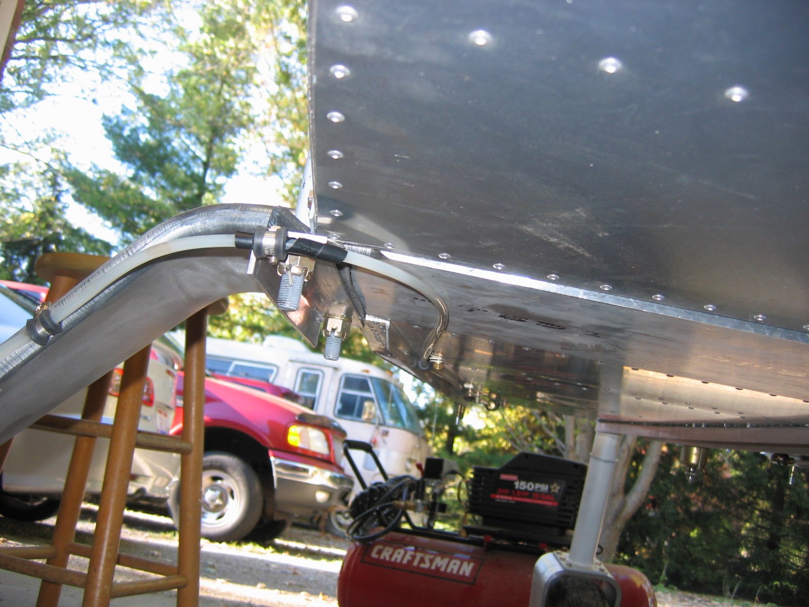 3. Brake line routing. ZAC says to route through the middle spar opening and out the side skins at the gear leg. I did not think I would have enough room there so I ran them below the cockpit floor and back along the fuselage bottom. Now that I have done this, I don't like the looks of it and may change back. Again, see picture attached.