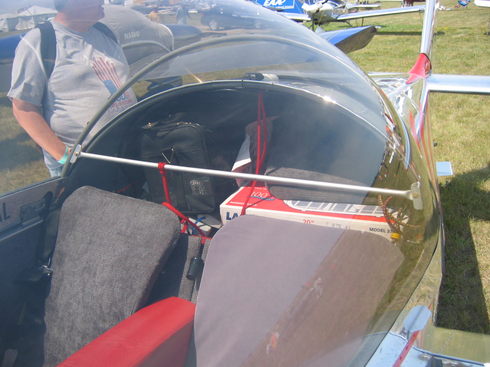 At Oshkosh last year, there was a customer built 601XL in the Zenith booth that had a modification which caught my eye. This XL had a bar going horizontally across from one side of the aft canopy support hoop to the other at just around shoulder level. The picture I took of it is attached to this post. I guess I can see both positive and negative attributes to this bar. It can give you something to grab to help in both opening and closing the canopy. On the other hand, I see where it could be a ‘head knocker’ or a barrier to being able to reach into the baggage area. Fortunately, in this airplane, it is bolted in and thus easily removable if it turns out to be more of a pain than a help.