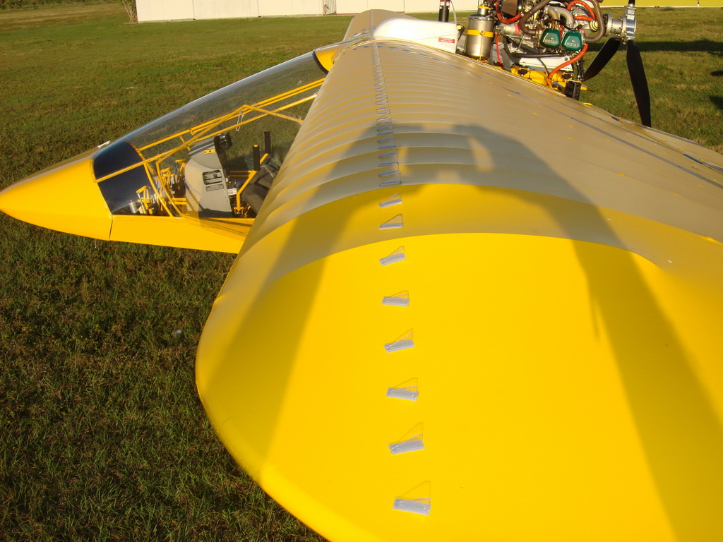 Once in a while we hear of a report where someone says they tried VG's, but that they did not work well... Look at the picture below to see how perfectly the VG's are installed on my Kolb. Like everything in aviation, the construction, size, shape, and installation of VG must be VERY PRECISE. If you screw up the installation, they might work, but not nearly as well as they should. If anyone is considering this, take your time doing the install as perfectly as humanly possible, it will be well worth the effort. You can get VG's at www.landshorter.com