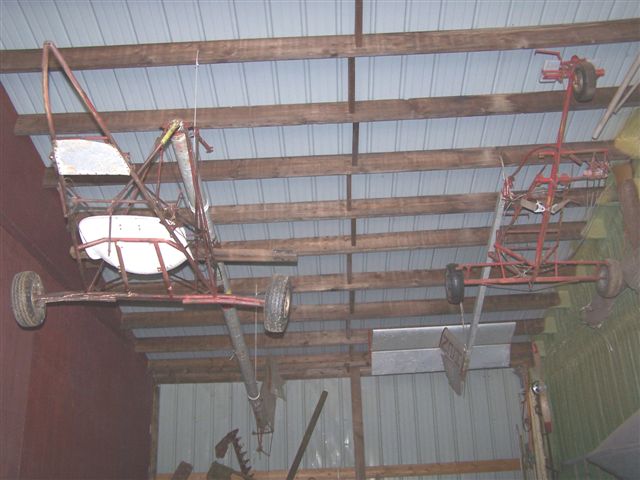 Pic 1049, the cage on the right is the original Fire Fly built in 1959. Had a T-tail all metal, 22 foot wing span and powered by 4 X 10 hp Westbend engines. Homer only flew this one on Crow Hops .