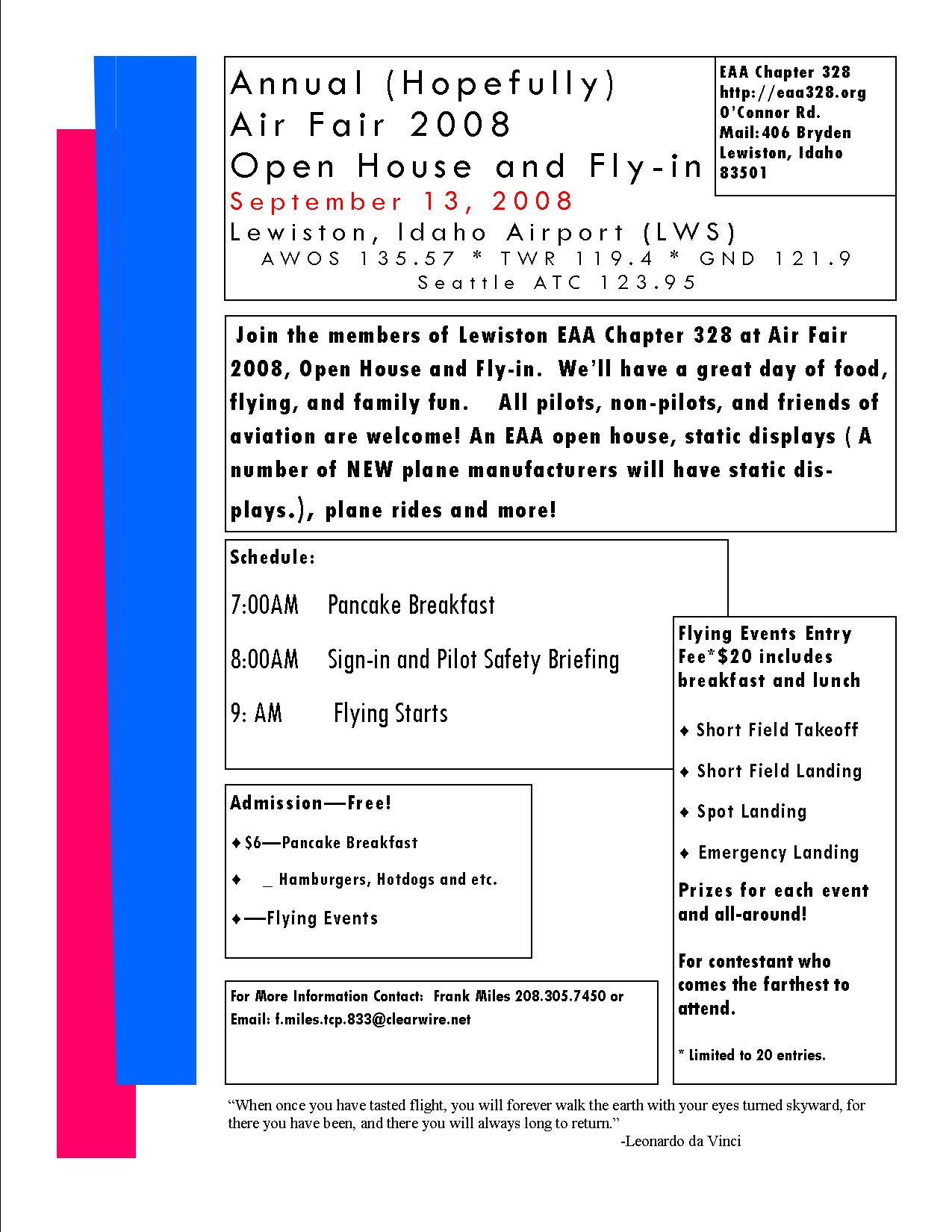 The Lewiston, Idaho chapter 328 of EAA is having an open house and fly-in Saturday, 9/13. We expect to have a new Kitfox on static display with someone from the factory to explain their product so if you are in the area, COME ON DOWN. (If you know Lewiston, you have to come down to get here!) The festivities start at 7 a.m. with breakfast. See attached flyer.