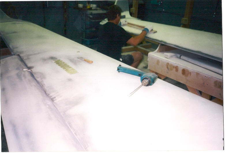 one side of a wing or a fuselage) at once with a coat of filler