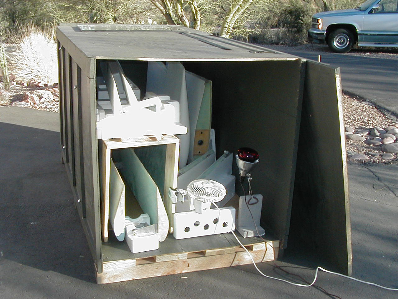A question about post curing our epoxy parts. Today we built ourselves an "oven" for baking our parts at the appropriate 40-50 degree celsius for post cure. We built a 16' X 4' X 4' enclosure out of foil claded 4X8 sheets of insulation foam. The box is backed up to a basement brick fireplace (no open flames) in which I would like to place a suitable heating element. I also have use of an attic fan to low air around the cavity.