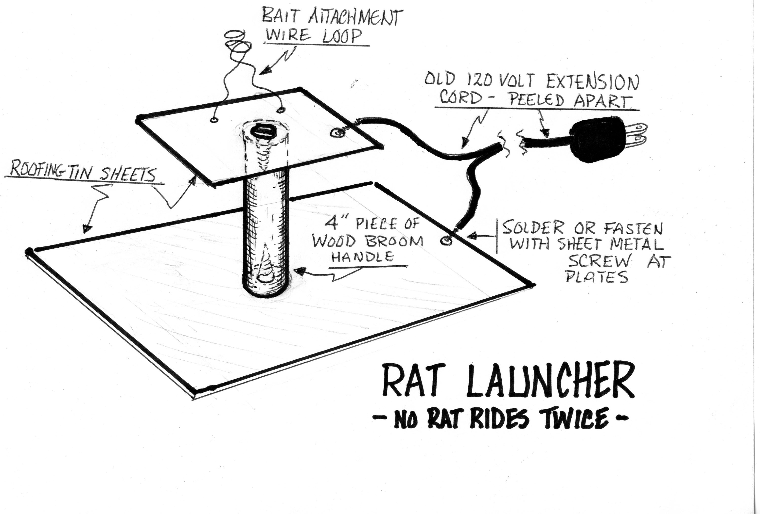 The device shown in the attachment was the result... I did not conceive of this thing, I had seen one in use on another farm. It is cheap, easy to make, and has no moving parts except the rat....and believe 'ol Beauford, the rats some kinda move when they hop on this sucker. I have seen 'em literally bang off an 8 foot ceiling over this thing. You haven't lived until you have seen a smoking rat executing a ballistic trajectory all the way across the room.