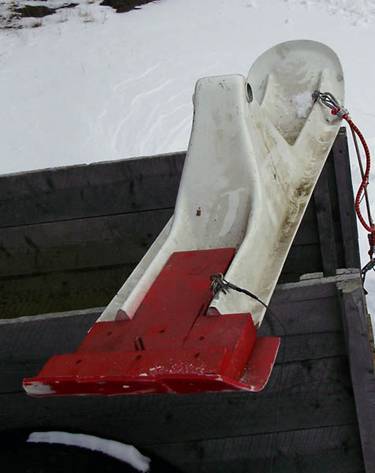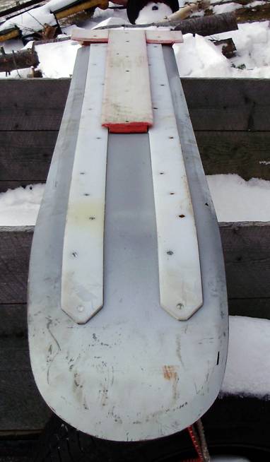 Picture 3. This angle shows the axel is straight and it also shows the two thin Teflon plastic runners on the bottom of the ski. Notice no whear bars as the skis are not to be used on bare pavement.