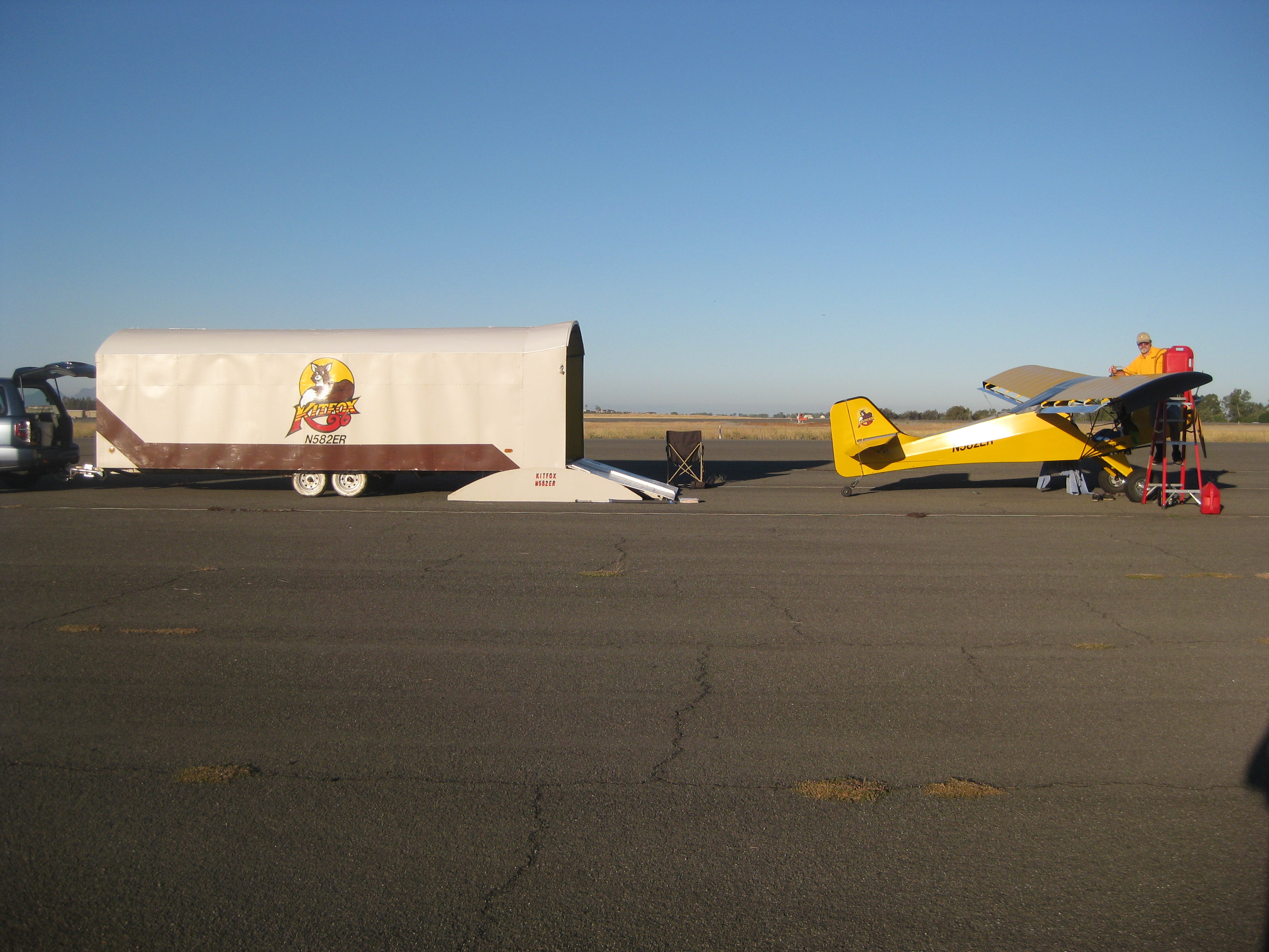 This is what I had to build to store the kitfox because I could not get a hanger, this cost me $1100, made from a old boat trailer, EMT and sheet metal. Just have to drain fuel, fold wings and tie down , tows great , stays dry. Hand painted the logo ( I did ask the John if I could ) It's 8' 6" by 23' wings are tight but when tied down Will not hit the sides . I have towed it long and short distances, works for me