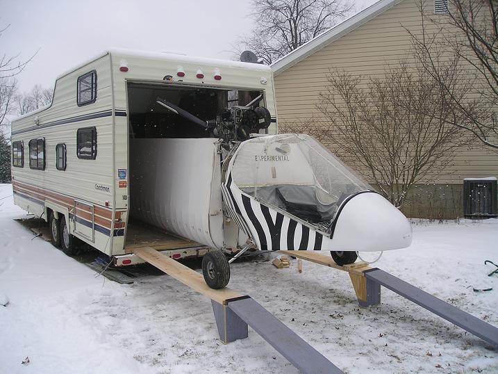 Here is the new trailer that I have been working on for my MKII. It started life as a Coachman bunkhouse in 1982, but now has realized it's true calling. That of a Kolb toy hauler. I have a bunch more before and after pictures on my web site http://home.comcast.net/~mmorrison123/trailer.htm . I'm not sure if this is thinking outside the box, inside the box, or just thinking about the box itself?
