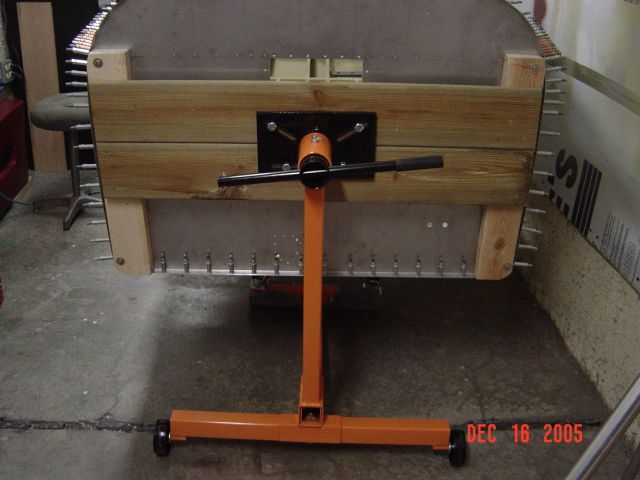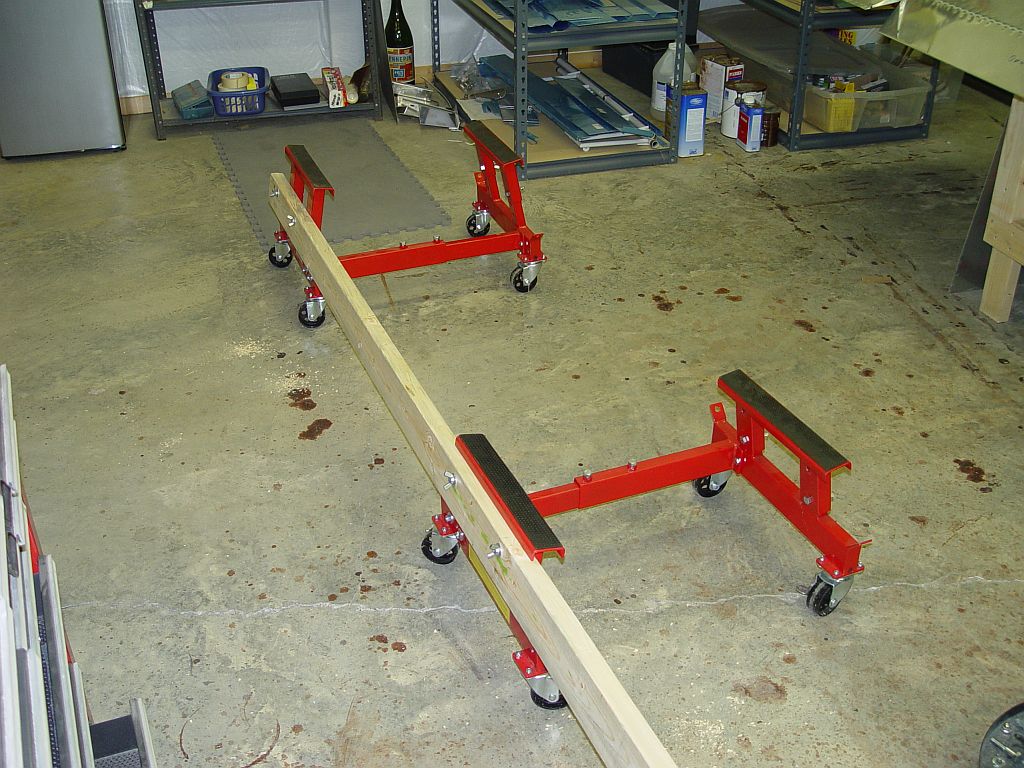 I used two motorcycle stands from Harbor F (they were on sale). I used a couple of 2x4s to connect them, then I threw a 4x4 board on top. Crude but it is VERY easy to roll around.