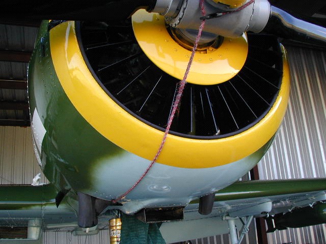 Attached is a photo of the lower cowling on a Yak 52 with a bungee cord pulled from one of the exhaust stack holes up to and around one of the prop blades at the root of the blade. This holds the lower cowl in place while you open the top cowl. Remove the latch pins at the rear of the cowl at the junction of where the top and bottom cowl meet. Many 52's no longer have these in place. Next, loosen the latch fasteners on each side of the cowl by turn each fastener 1/4 turn counterclockwise. Lift each side of the upper cowling so as to release the top cowl from the bottom cowl. Place a rag or rubber mat on the top of the front canopy eyebrow glass. This will prevent the top cowl from scratching the eyebrow glass. Place a small rag or something similar at the top of the nose strut behind the back edge of the lower cowl. This will prevent the lower cowl from nicking the paint on the nose strut when it is removed. Using a short step ladder, stand directly in front of the prop dome, grab the top cowl on either side by the latches and lift and push the cowl toward the canopy. Place the top cowl on the pins just behind the leather baffle end pieces at the #2 and #9 cylinders.