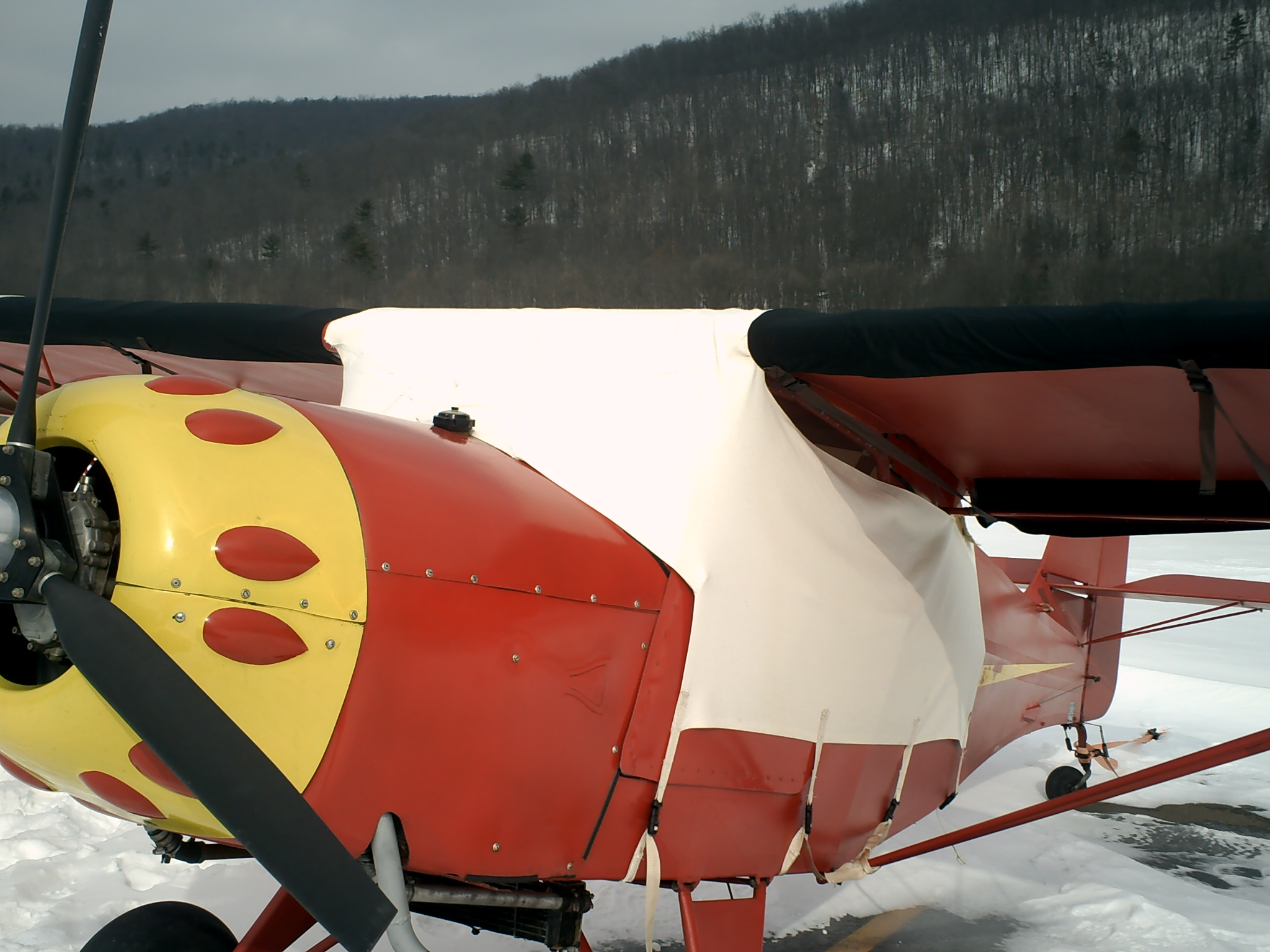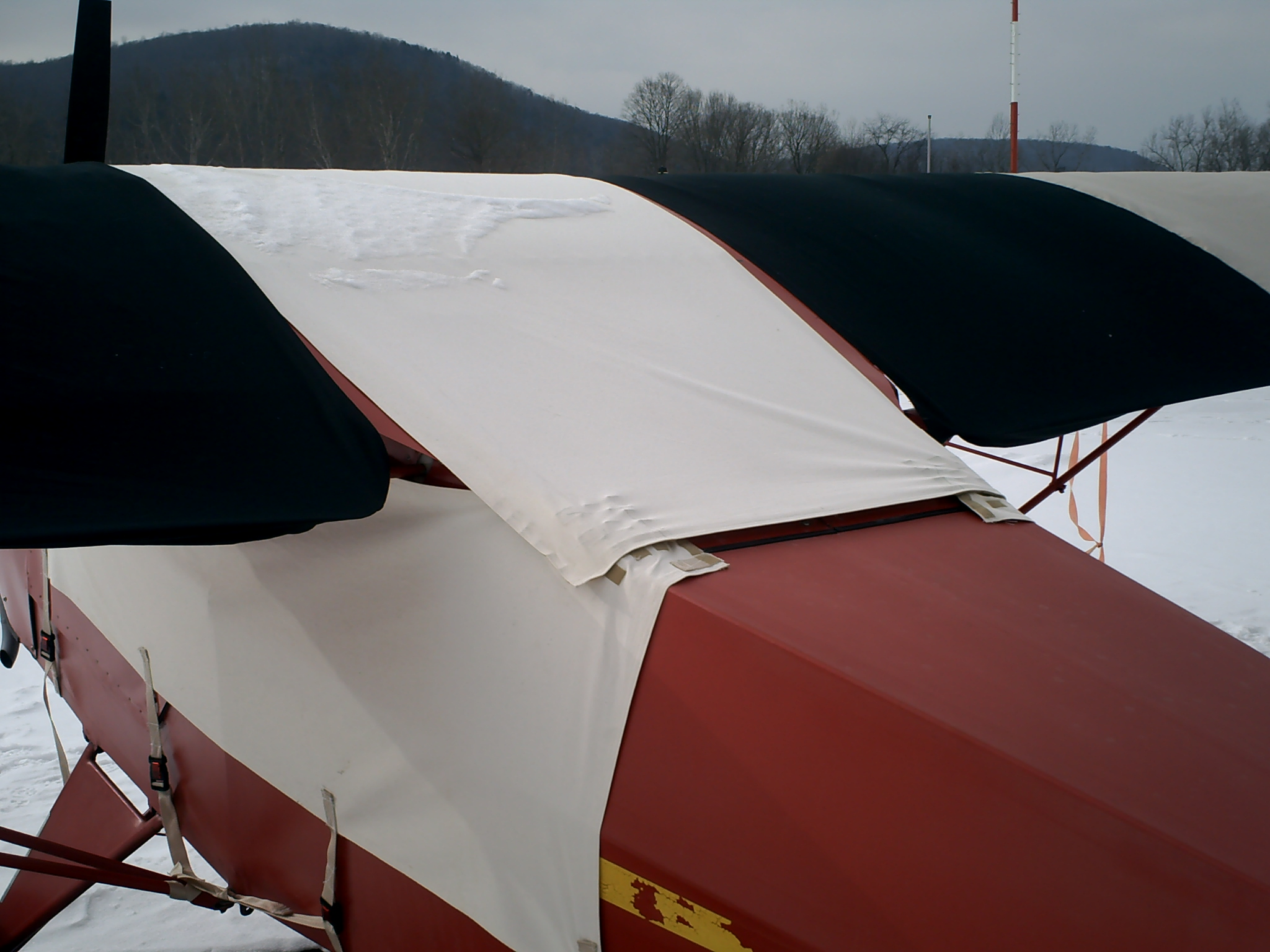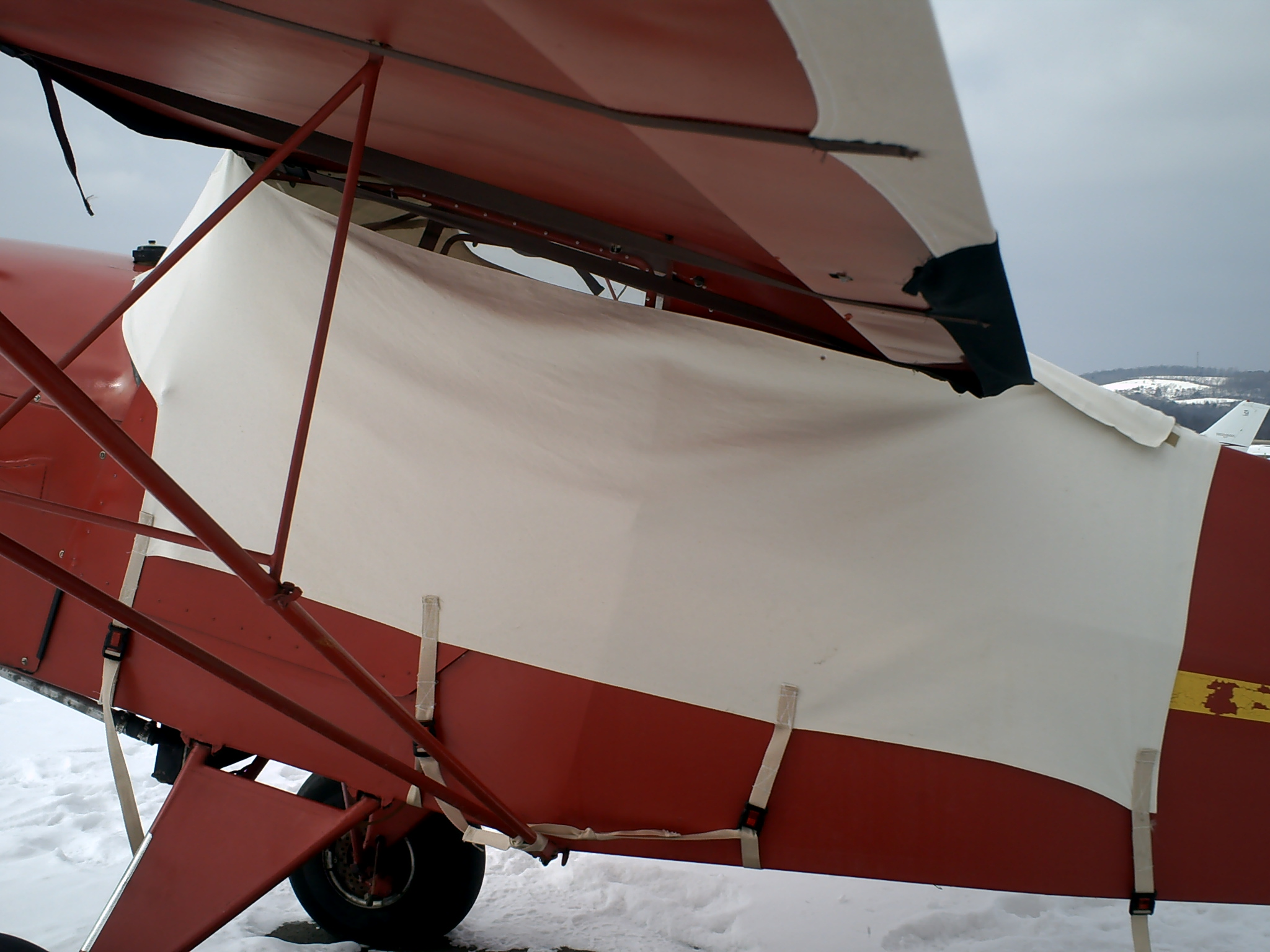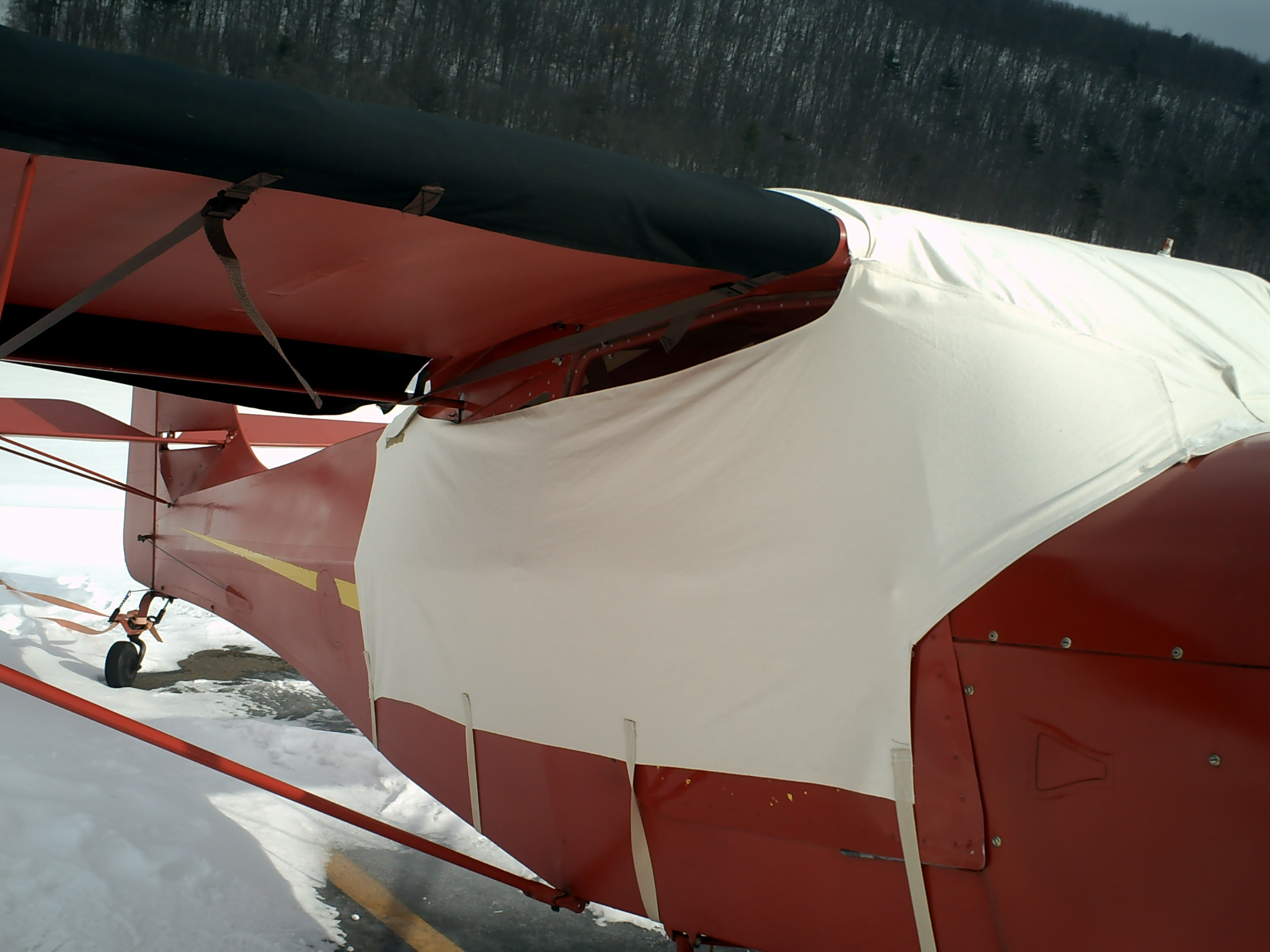 The canopy cover, covers the windshiled, up over the top, and down over the turtle deck. Side pannels wrap around the doors, and connect to the back part near the turtle deck. Four 1" straps hold it in place, probably could have used three though. When i cut it, I made it a little big, so it leaves about 2" of the side windows exposed rught under the wing. Not a big deal, as they are right under the wing.