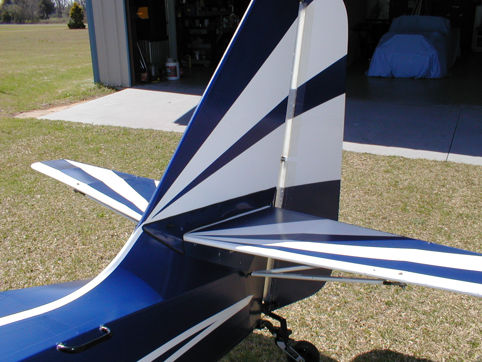Thanks for the complement on my TR3. The gap seal on my rudder is a vertical piece of contoured foam that I covered with 6 inch Polyfiber tape and painted. If you look at the picture, the hinge areas were not covered so that I would have access to the hinge bolts. Previously that entire area between the vertical stab and rudder was about a 2 inch gap. The contoured foam is available from John McBean. I epoxied it to the trailing edge of the vertical stab. The aircraft was already painted but I could not stand to look at that huge gap so I had to do it. I have enclosed a picture of a taped temporary rudder gap seal I tried (looked horrible) and it shows the old gap a little better.