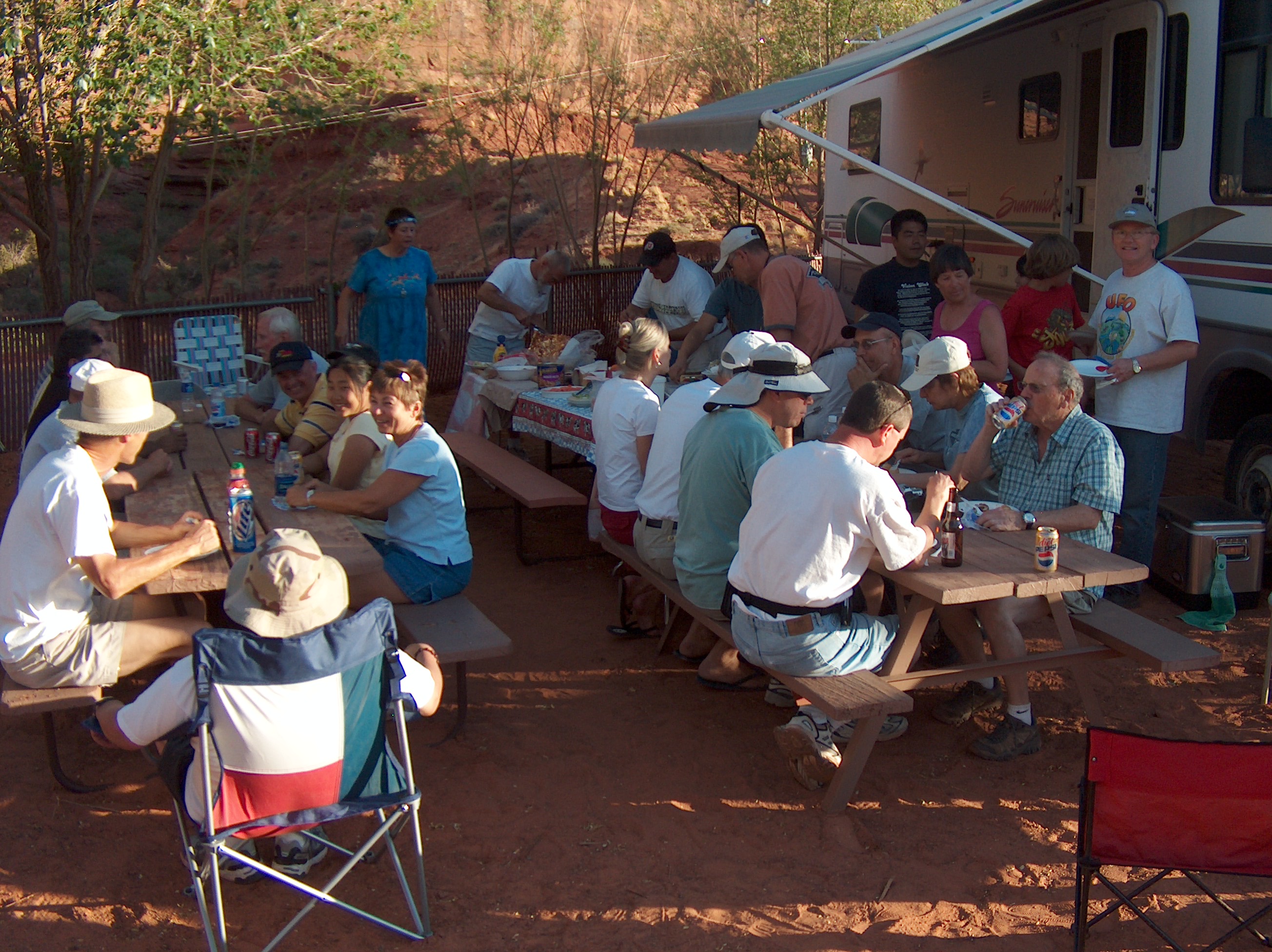 Since Dave has been having problems posting his photo's, I'm going to help him by posting the last 4 he tried to post here since he sent them to me. They are some good people shots from mid day gatherings to the nice picnic dinner Eve and Dave put on at their motor home Saturday evening. Dave told me yesterday he counted 41 at the dinner at one point and I know there were several others that didn't make it so I would guess we had around 50 or so in attendance this year, making it the biggest turnout yet.